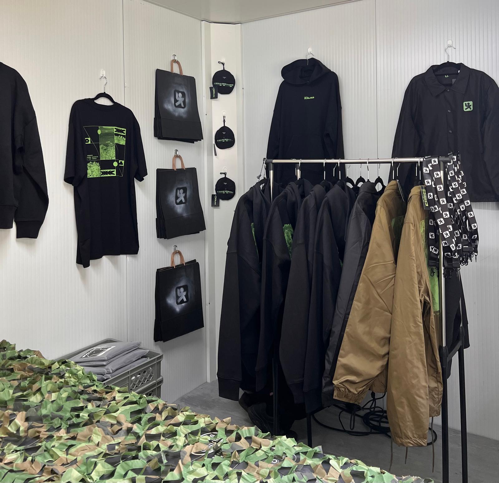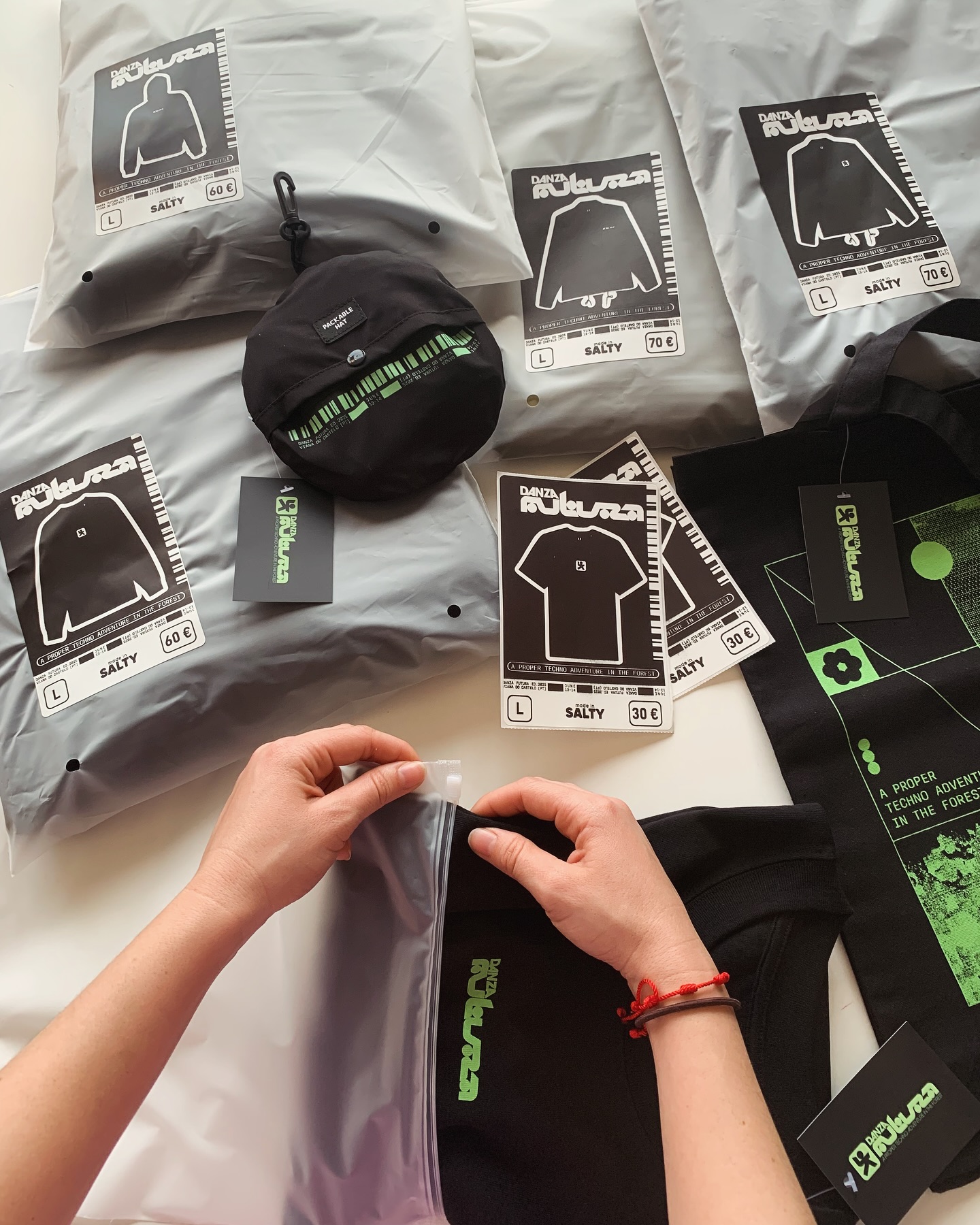 Trabajamos packaging personalizado, etiquetado interior y exterior en cada prenda, presentación del merch en un evento previo al festi y acompañamos el montaje del stand durante el propio festival, asesorando en selección de prendas, cantidades y pricing.