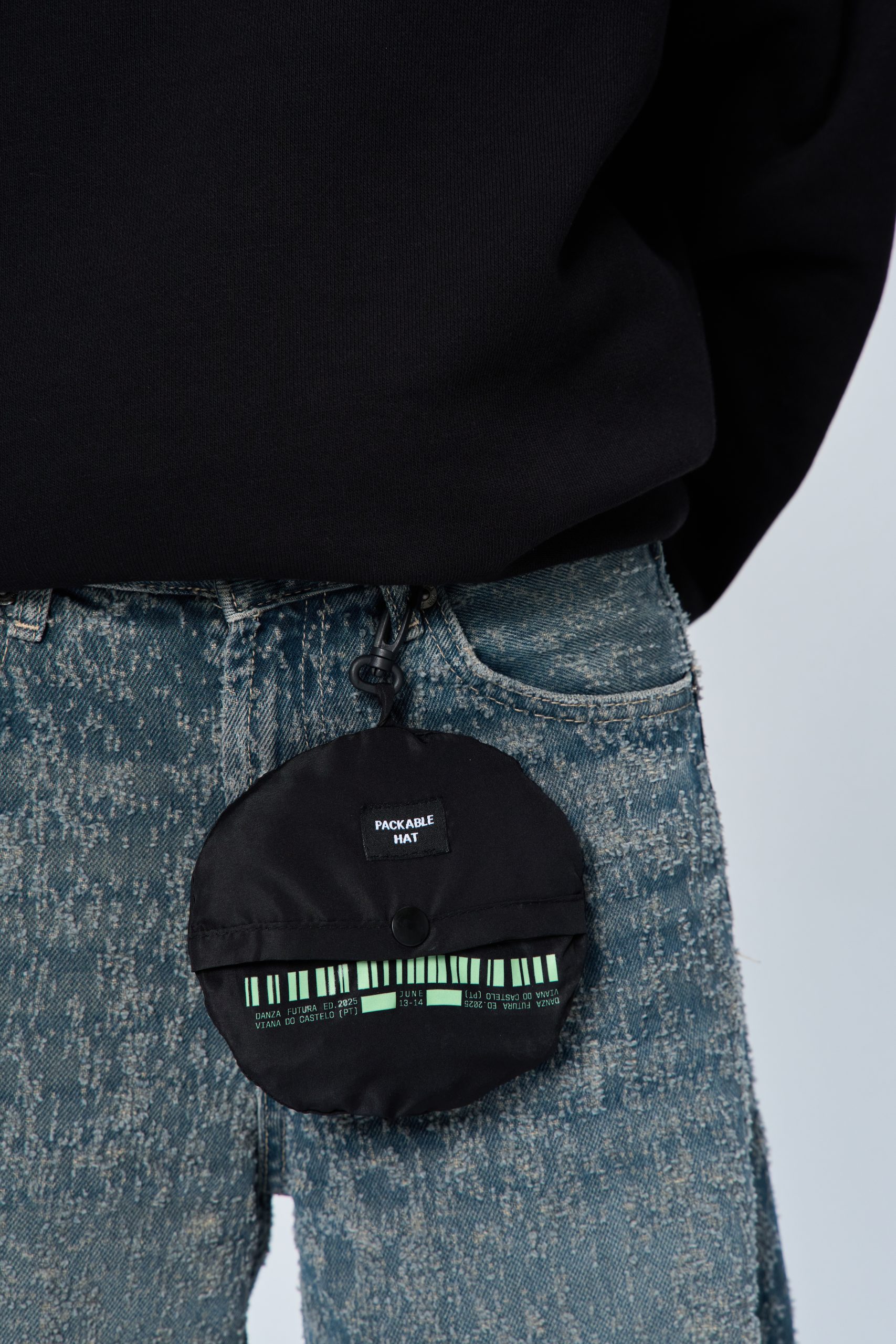 En la segunda edición —nuestro primer año juntos— desarrollamos una línea completa: camisetas y sudaderas premium, tote bags y chubasqueros con serigrafía, bucket hats con DTF y camisetas self awareness pensadas para reforzar la seguridad del evento y del staff.